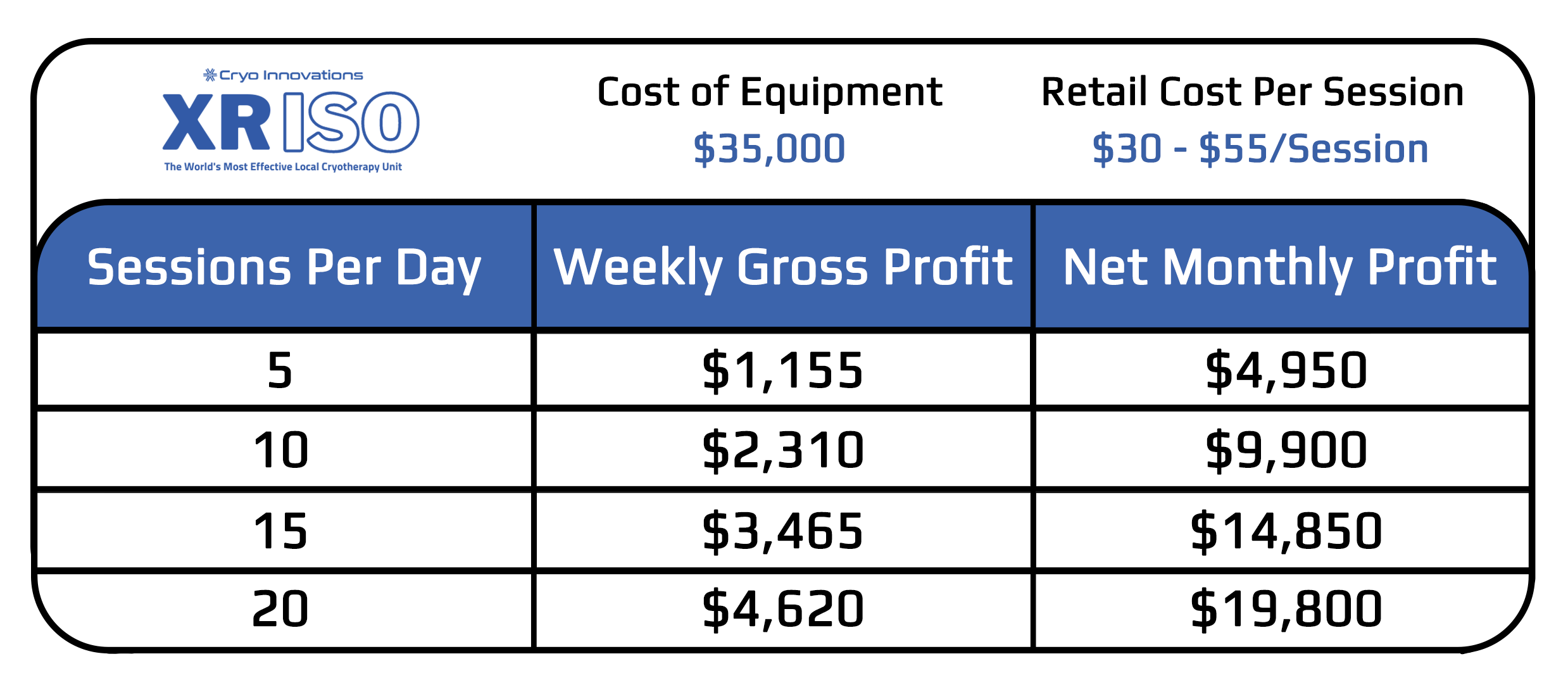 Analysis of the return on investment for the XR ISO localized cryotherapy system, including revenue potential, cost efficiency, and profitability insights for wellness centers, clinics, and beauty professionals.